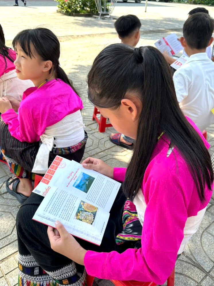 Học sinh người dân tộc Thái vui mừng nhận và đọc ngay quyển sách “Dạo khắp một vòng Việt Nam” do Thảo Nhi tặng