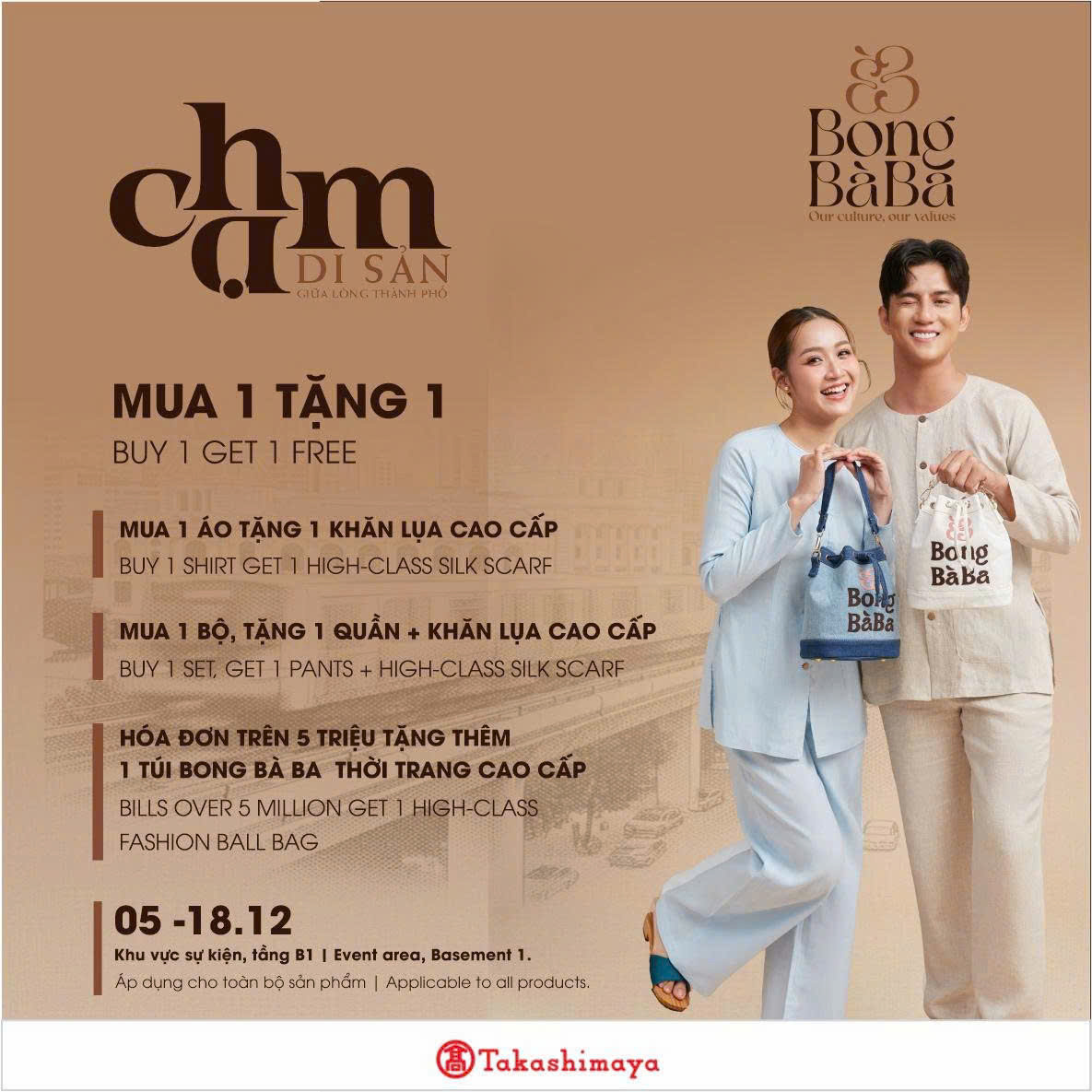 Ngày 06/12/2025, thương hiệu thời trang di sản BONG BÀ BA chính thức giới thiệu những bộ sưu tập bà ba đầu tiên đến khách hàng với thông điệp “Chạm Di Sản Giữa Lòng Thành Phố” tại Tầng B1, Khu Vực Sự Kiện,Trung tâm Thương mại Takashimaya (Saigon Centre).