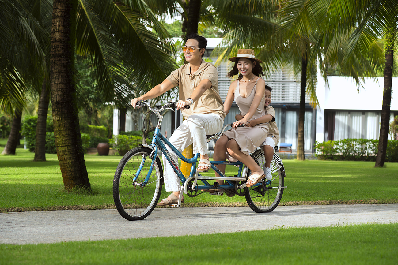 Trong những ngày lưu trú, gia đình dành thời gian đạp xe dọc những cung đường ven biển, khám phá vườn tiêu xanh mướt, hay đơn giản là nằm dài bên hồ bơi vô cực, để lũ trẻ thoả sức nô đùa. Huyền Thanh chia sẻ: “Ở đây, tôi nhận ra rằng sự gắn kết gia đình đôi khi đến từ những khoảnh khắc rất giản đơn, cùng nhau ngắm hoàng hôn trên biển, hay cùng con xây lâu đài cát.”