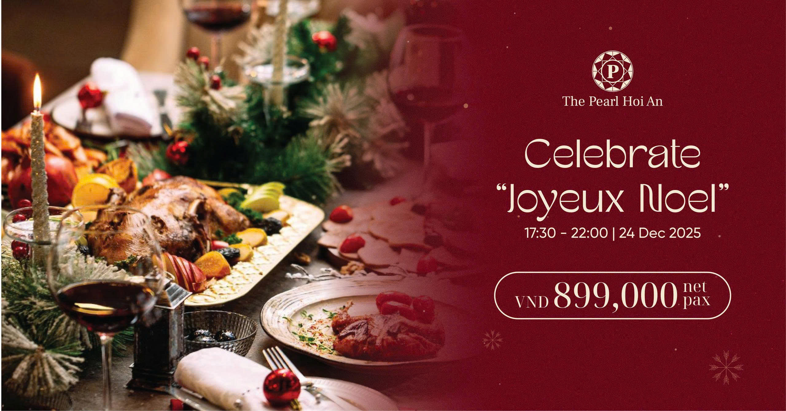 Trước đó, vào đêm 24/12/2024, The Pearl Hoi An sẽ tổ chức bữa tiệc Giáng sinh "Joyeux Noel". Diễn ra tại khu vực The Pearl Zone, sự kiện hứa hẹn mang đến không khí an lành, những món ăn đặc trưng của mùa lễ hội và các hoạt động giải trí trọn vẹn.