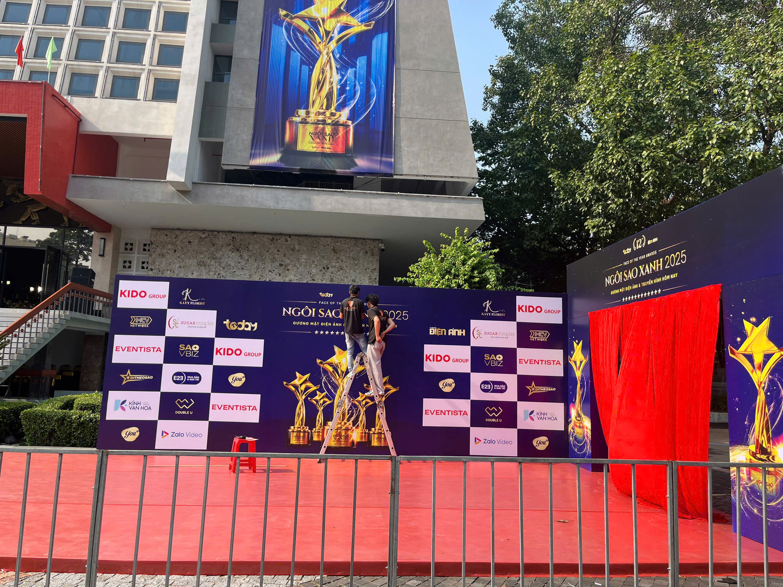 Ghi nhận trong ngày tổng duyệt, khuôn viên Nhà hát Hòa Bình đã được trang hoàng rực rỡ với hệ thống backdrop, banner cỡ lớn và khu vực check-in được thiết kế đồng bộ. Tượng cúp vàng Ngôi Sao Xanh - biểu tượng quen thuộc của giải thưởng - được trưng bày nổi bật tại khu vực sảnh, thu hút sự quan tâm của đông đảo công chúng và giới truyền thông. Không gian thảm đỏ phía trước nhà hát cũng đang được hoàn thiện những khâu cuối cùng. Các hạng mục an ninh, phân luồng báo chí và khu vực dành cho người hâm mộ đã sẵn sàng, hứa hẹn mang đến một đêm vinh danh trang trọng nhưng vẫn gần gũi với khán giả.