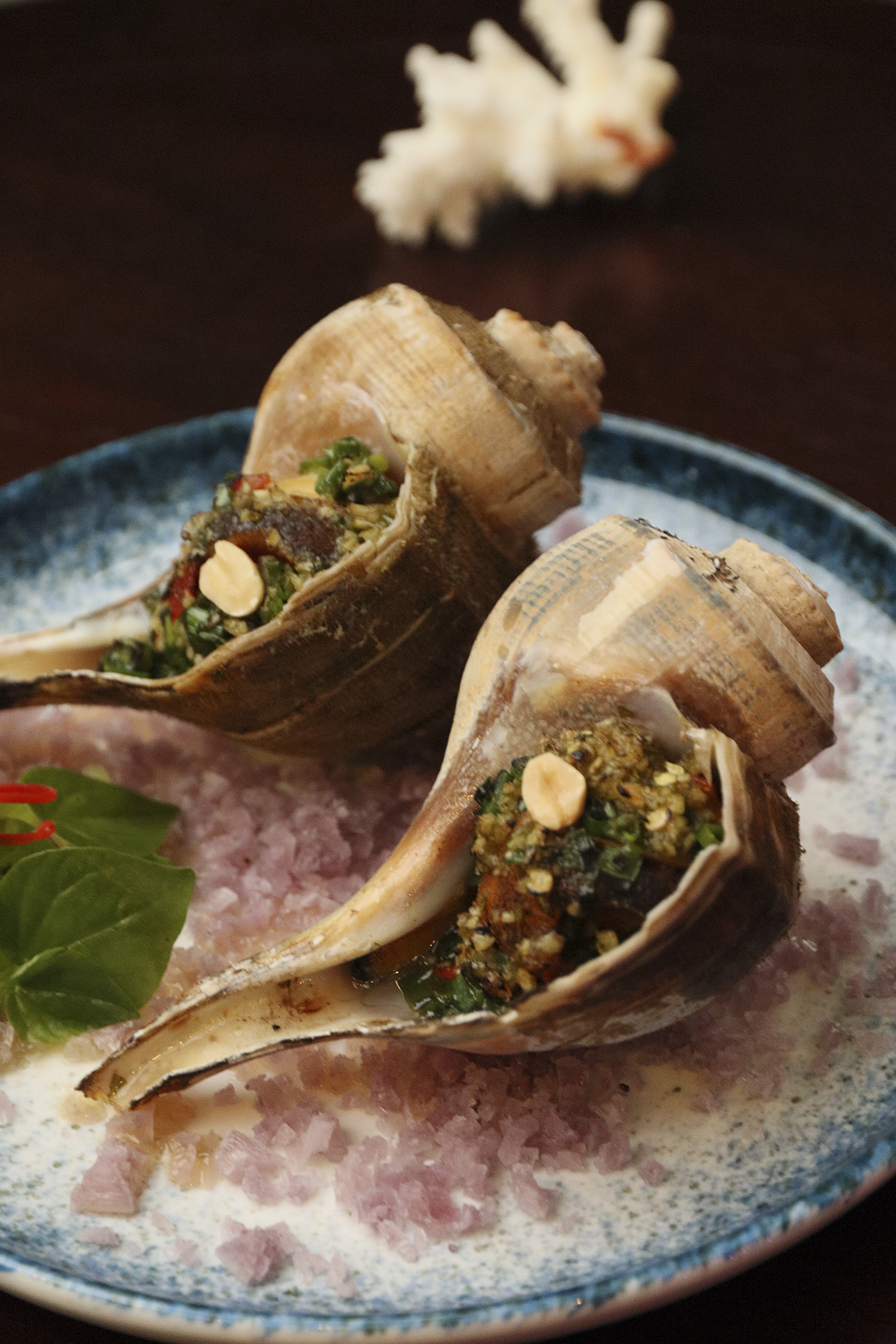 Thực đơn còn có thêm lựa chọn cho những thực khách yêu món nướng với món Ốc kèn nướng mắm ngò. Món ăn được phục vụ nóng hổi, thơm lừng, ấn tượng bởi vị ngọt tự nhiên của ốc thấm đẫm vị cay nồng, thơm the đặc trưng của tiêu rừng và mắm ngò thật sự rất cuốn hút vị giác.