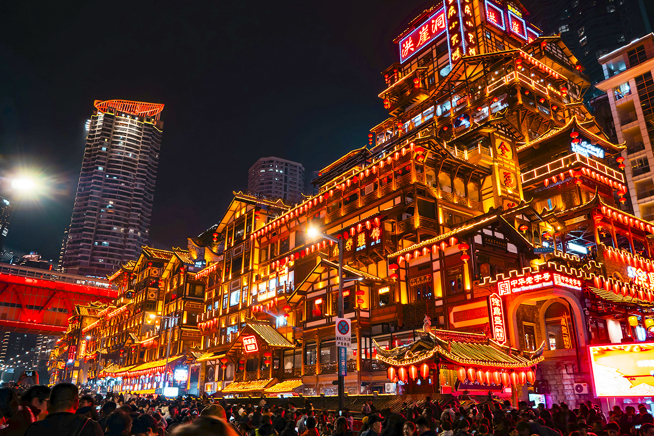 Tọa lạc bên dòng Gia Lăng thơ mộng, phố cổ Hồng Nhai Động được mệnh danh là “viên ngọc sáng giữa lòng Trùng Khánh” – nơi giao hòa tuyệt đẹp giữa lịch sử ngàn năm và nhịp sống hiện đại. Công trình 12 tầng nhà sàn tựa lưng vào vách núi, rực rỡ ánh đèn khi đêm xuống, khiến du khách ngỡ như lạc vào khung cảnh trong bộ phim Vùng đất linh hồn. Nơi đây được xem là phố không ngủ, bạn dạo bước qua những lối nhỏ lát đá từ sớm hay khuya, nơi đây cũng tràn ngập du khách đang thưởng thức món lẩu cay, hay mua sắm quà lưu niệm mang đậm dấu ấn văn hóa Ba Thục. Từ ban công nhìn ra, khung cảnh sông nước hòa cùng ánh sáng lung linh của thành phố tạo nên bức tranh huyền ảo khó quên. Đặc biệt ban đêm, Hồng Nhai Động luôn là điểm dừng check in của các bạn nữ trẻ, trang điểm lộng lẫy trong trong phục ‘thần tiên tỷ tỷ’ chụp ảnh những góc đẹp khiến khung cảnh càng thêm mộng mị. Đứng trên du thuyền chạy dọc sông Dương Tử vào ban đêm, Hồng Nhai Động là điểm nhấn đặc sắc nhất với đèn led được viền theo kiến trúc cổ kính nơi đây.