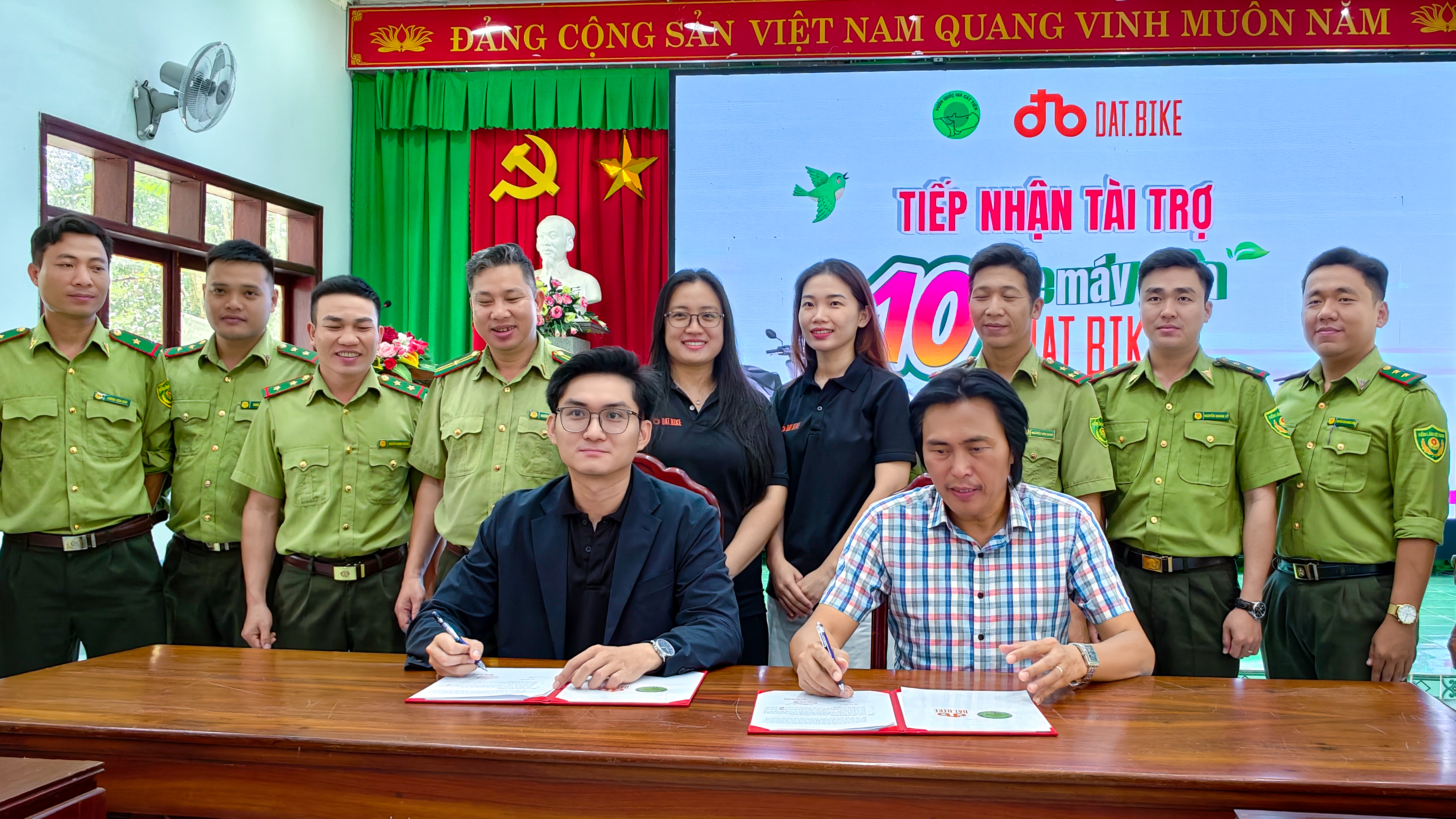 Cũng trong khuôn khổ buổi lễ, hai bên đã thực hiện nghi thức ký kết thỏa thuận tài trợ, đánh dấu bước phát triển mới trong mối quan hệ hợp tác. Ngay sau đó, Giám đốc Vườn Quốc gia Cát Tiên đã trao quà tri ân đến đại diện Công ty Dat Bike như lời cảm ơn chân thành cho sự hỗ trợ quý báu này và mong muốn tiếp tục nhận được sự quan tâm, đồng hành của các tổ chức, doanh nghiệp trong hành trình chung tay bảo vệ thiên nhiên, vì tương lai bền vững.